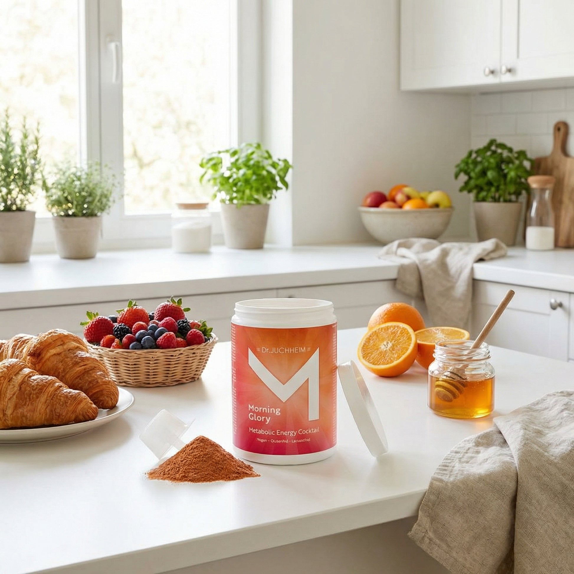 Morning Glory - Ein Powerdrink für mehr Energie und Wohlbefinden Du möchtest mehr Energie, Deine Ernährung verbessern und Deinem Körper geben, was er täglich braucht, Dein Immunsystem stärken, Deine Konzentration verbessern und Deine Verdauung optimieren ? Dann bist Du bei Dr. Juchheim genau richtig: Morning Glory von Dr. Juchheim ist vollgepackt mit Extrakten und Konzentraten aus Früchten, Beeren, Gemüse, Kräutern und Superfood, mit pflanzlichen Vitaminen und Powerstoffen für Wohlbefinden, Energie für jeden Tag, Regeneration nach dem Training oder nur um den stressigen Alltag zu bewältigen. So einfach kann Energie sein. Einen Messbecher a 14 g MorningGlory in Wasser auflösen und trinken. Morning Glory macht es einfach, in Deine tägliche Ernährungswertvolle Früchte, Beeren, Gemüse, Kräuter und Superfood einzubauen, ganz ohne Aufwand für Vorbereitung und Kochen. Und dazu noch deinen Energielevel anzuheben, Deine Konzentration, Verdauung und Immunsystem zu verbessern. Morning Glory passt perfekt in Deine täglich Wohlfühlroutine.